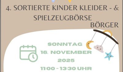 Am Sonntag, den 16. November 2025, findet im Gemeinde- und Kulturzentrum Börger die 4. Kinderkleider- und Spielzeugbörse von 11:00 - 13:30 Uhr statt. Außerdem gibt es leckeren Kuchen den man gegen eine freiwillige Spende mitnehmen kann (gerne eigene Behälter mitbringen). Die Einnahmen werden an den "Förderverein für Kinder- und Jugendarbeit Börger" (JuKi) gespendet. Das ist eine großartige Gelegenheit, um schöne Dinge für die Kleinen zu finden und gleichzeitig die Gemeinschaft zu unterstützen.