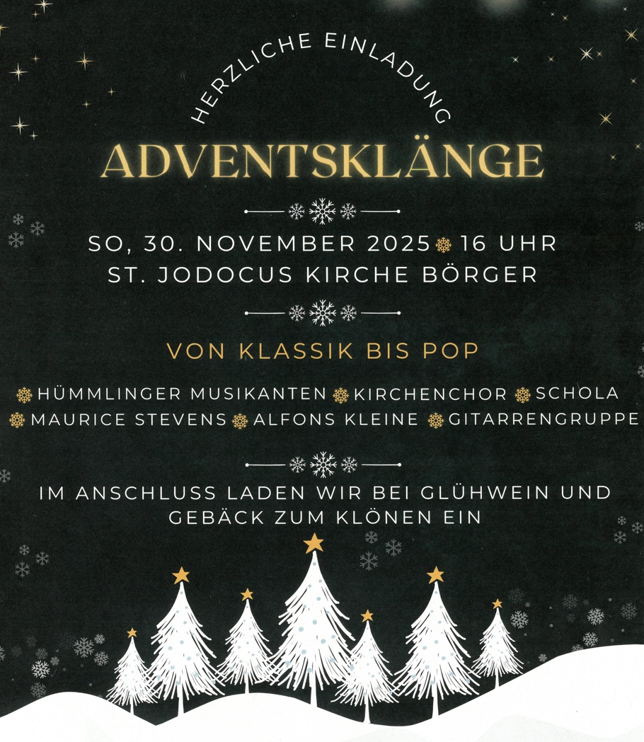 | 30.11.2025 | 16:00 Uhr | St. Jododcus Kirche Börger | Konzert 'Adventsklänge' | Einladung |